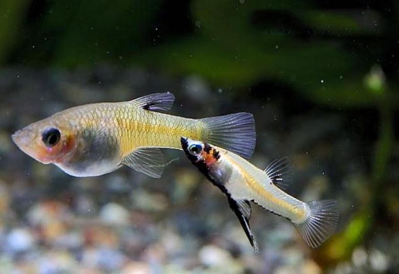 Samce majú ako pohlavný orgán gonopodium, z ktorého sa tiahne tmavý pruh pozdĺž tela až k hlave. Samce sú navyše štíhlejšie a o niečo menšie ako samice. Veľkosť samca dosahuje 3-4 cm a u samíc aj do 7-8 cm.